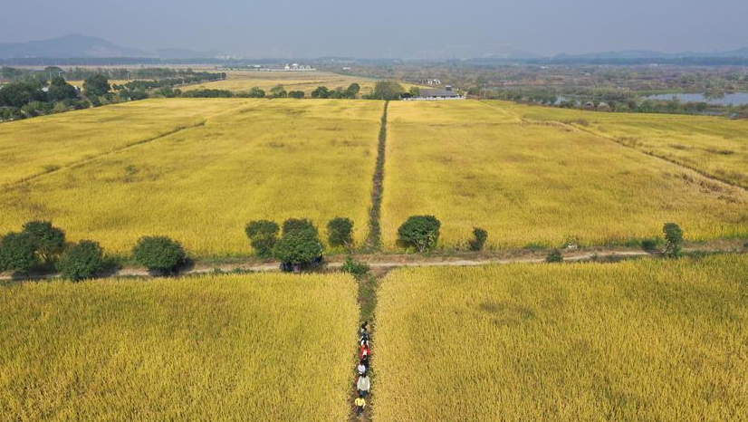 11月1日,湖州市吴兴区浮玉幼儿园的孩子在老师的带领下来到丰收的水稻田参观(无人机拍摄)。 近日,浙江省湖州市吴兴区道场乡钱山下粮油专业合作社千余亩水稻田迎来丰收季节。 新华社记者 翁忻旸 摄
