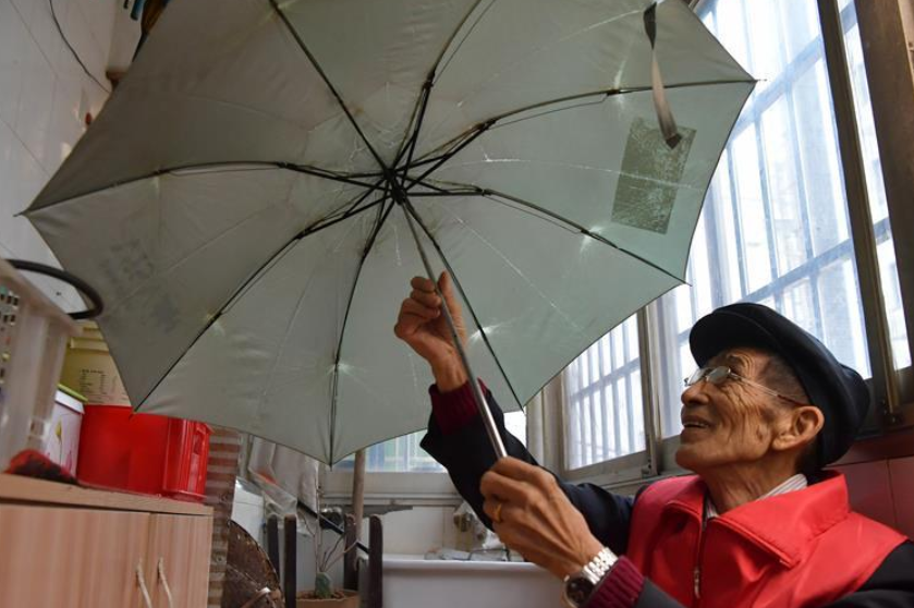 在江西省南昌市新建区花果山社区,况亮在家中把刚修理好的雨伞挂起来(12月18日摄)。新华社记者 彭昭之 摄