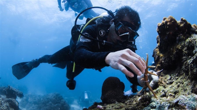 4月28日,在海南三亚蜈支洲岛海域,工作人员在海底的移植钉上固定珊瑚。 近日,中科院南海海洋研究所副研究员张浴阳带队来到海南三亚蜈支洲岛海域继续开展海底生态修复工作。从2016年开始,张浴阳便带队在此工作,这也是该团队“热带岛礁型海洋牧场发展模式创新与应用”项目的一部分。该项目旨在通过集成海洋牧场关键物种扩繁、食物网结构优化与承载力提升、资源环境信息获取等手段,建立可复制、可推广的现代化海洋牧场建设技术体系与流程。 新华社记者 杨冠宇 摄