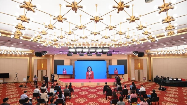 5月27日,在北京人民大会堂新闻发布厅举行全国政协十三届三次会议第三场“委员通道”采访活动。全国政协委员通过网络视频方式接受媒体采访。 这是记者在梅地亚中心分会场提问。 新华社记者 陈晔华 摄