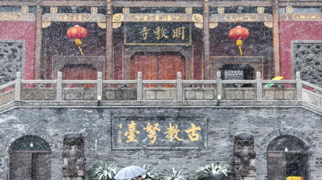 12月29日,在安徽省合肥市,行人冒雪走过明教寺。当日,入冬最强寒潮来袭,多地迎来今冬最寒冷天气。新华社记者 韩旭 摄