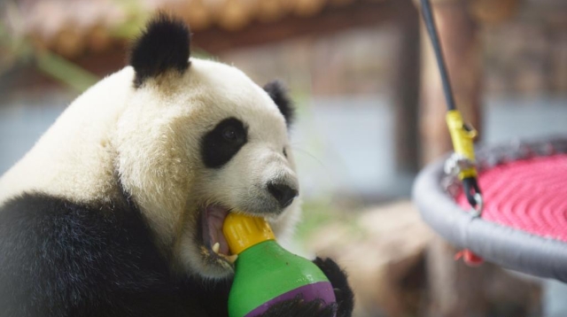 当日,在青海省西宁熊猫馆,大熊猫“奇果”“园满”迎来5岁生日会。工作人员用苹果、竹子等食物做成生日蛋糕和美食,还准备了不倒翁取食器等玩具为它们庆生。