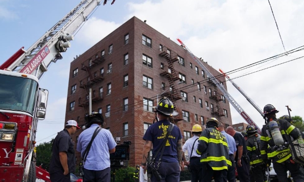 8月10日,消防员在美国纽约发生火灾的居民楼附近工作。
