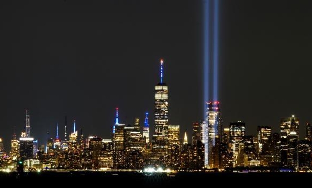 9月11日,美国纽约世贸中心遗址附近亮起象征纽约世贸中心“双子塔”大厦的光柱。新华社记者王迎摄