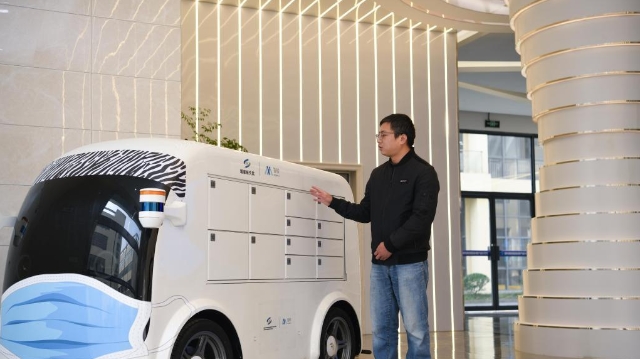 在国邮快递物流智能装备(南陵)产业技术研究院内,工作人员在介绍一款快递配送无人车(12月10日摄)。 新华社记者 张端 摄
