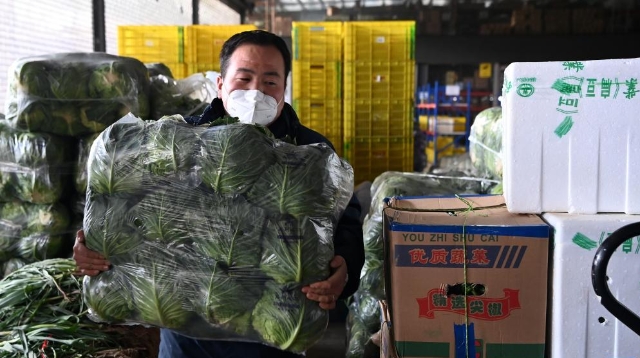 陕西米禾供应链管理股份有限公司的工作人员在搬运蔬菜(12月19日摄)。