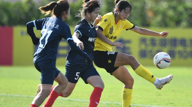 4月10日,广东梅州客家队球员廖美欣(中)在比赛中突破。 当日,在海南海口举行的2022年中国足球协会女子超级联赛第二轮比赛中,广东梅州客家队以2比0战胜山东体彩队。 新华社记者 胡智轩 摄