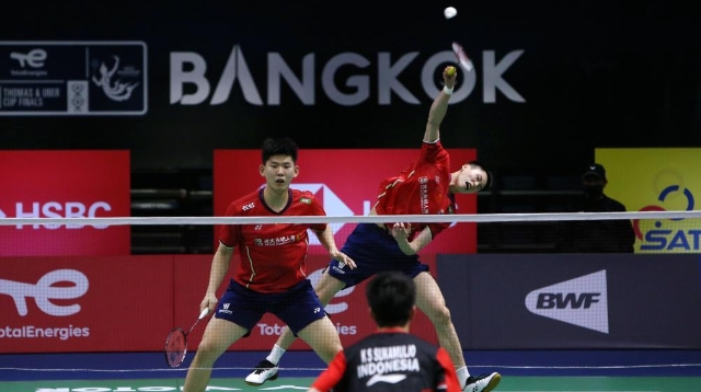 5月12日,印尼队选手克里斯蒂在比赛中回球。他在男单比赛中以2比0战胜中国队选手李诗沣。 当日,在泰国曼谷举行的汤姆斯杯羽毛球团体赛四分之一决赛中,中国队以0比3不敌印度尼西亚队,无缘四强。 新华社记者 王腾 摄 5月12日,中国队组合刘雨辰(右)/欧烜屹在男双比赛中,他们以0比2不敌印尼队组合阿山/苏卡穆约。 当日,在泰国曼谷举行的汤姆斯杯羽毛球团体赛四分之一决赛中,中国队以0比3不敌印度尼西亚队,无缘四强。 新华社记者 王腾 摄