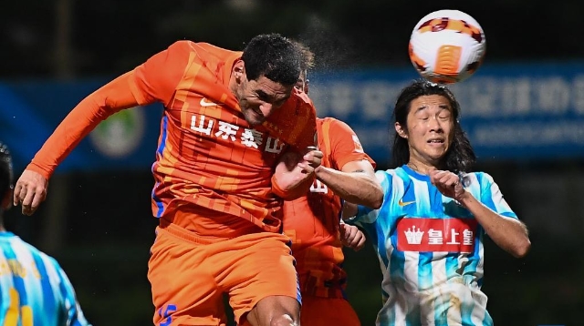 6月12日,山东泰山队球员费莱尼(左)在比赛中头球攻门。新华社记者 胡智轩 摄