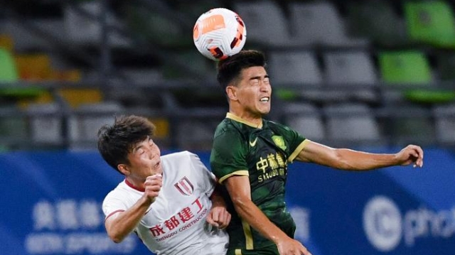6月30日,成都蓉城队球员理查德(左)在比赛中争顶。新华社记者 王冠森 摄