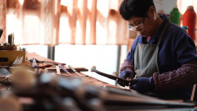这是3月28日在江苏无锡梅村街道二胡产业园拍摄的制作二胡用的蟒皮。