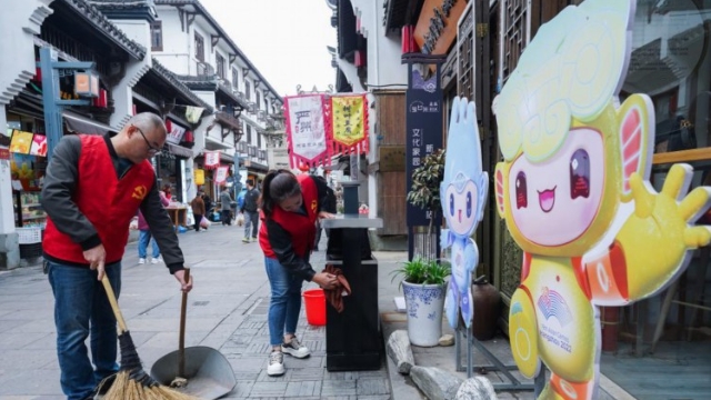 4月24日,在建德市梅城镇古街,社区党员干部、志愿者在打扫古镇卫生。