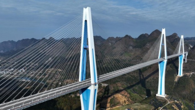 这是12月6日拍摄的贵州省平塘特大桥一景(无人机照片)。 初冬时节,在贵州省黔南布依族苗族自治州平塘县,高山峡谷之间的平塘特大桥巍然屹立,自然风光与大桥雄姿吸引了众多游客。近年来,平塘县依托平塘特大桥推进“桥旅”融合发展,着力打造集桥梁博物馆、天文科普馆、悬崖酒店等于一体的综合旅游景点。 新华社记者 杨楹 摄