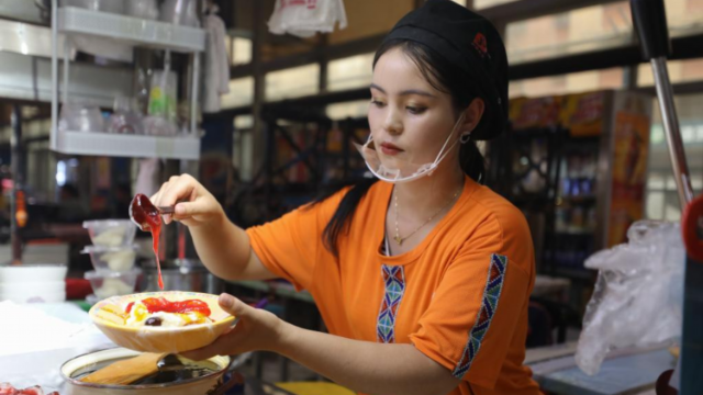 6月4日,在新疆和田夜市,麦斯图热姆·阿卜杜穆柯依提把粽子压扁,准备制作酸奶粽子。 端午粽飘香。在新疆和田,特色小吃——酸奶粽子也进入销售旺季。把糯米粽压扁后,淋上特制的酸奶、糖稀和果酱,就可制成一份酸甜可口的酸奶粽子。这道融合了粽子、酸奶、蜜果等多种食材的甜点,在新疆常年流行,不仅是当地人的日常美食,也成为游客体验地域美食文化的热门选项。 新疆畜牧业资源富集,特色林果业规模大,为酸奶粽子提供了丰富的土壤。在和田地区,粽子里用的是和田枣,所用酸奶多为手工制作,而加的果酱中无花果、木瓜最受当地人喜爱。 小小的酸奶粽子为生活增添了甜度,也为不少农户拓宽了增收渠道。随着生产、保鲜、物流等技术的不断提升,更多人投入到酸奶粽子的生意中,这项新疆名小吃也逐步走向全国,成为更多人选择的新“食”尚。 新华社记者 杜潇逸 摄 |