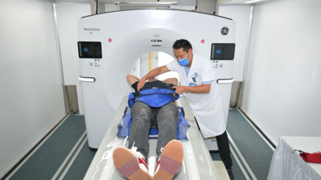 6月13日,在北京工人体育场举办的新就业形态劳动者移动体检活动上,快递小哥在移动体检车上做肺部CT检查。 新华社记者 才扬 摄