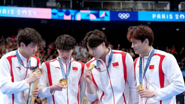 当日,在巴黎奥运会游泳项目男子4x100米混合泳接力决赛中,中国队以3分27秒46的成绩夺得金牌。
