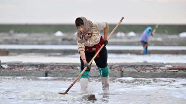 11月8日,盐工在盐田里劳作。 在福建省泉州市泉港山腰盐场,盐工们沿用传承千年的七步走水晒盐技法,依靠阳光、海风,将海水层层筛滤、纳潮、制卤、结晶、旋盐、扒收、淋卤、堆坨,历时多日晒制优质海盐。晒盐场景成为海岸线上一道独特的自然与人文景观。 据了解,山腰盐场是福建省第二大国有盐场,盐田保护区面积9.2万公亩,年生产海盐6.5万吨。2022年,福建海盐传统晒制技艺(泉州)入选第七批福建省省级非物质文化遗产代表性名录。 新华社记者 姜克红 摄