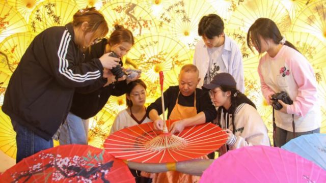 11月13日,在泾县昌桥乡孤峰村的国民油布伞厂,省级非物质文化遗产传承人郑国民为前来研学的学生介绍油布伞制作技艺。 位于安徽省宣城市泾县昌桥乡孤峰村的国民油布伞厂生产的传统油布伞,是当地的一张文化名片。泾县油布伞制作技艺是安徽省省级非物质文化遗产。一把油布伞制作分为制作伞长骨、穿制伞架、油制伞面、晾晒等12道大工序88道小工序。 新华社记者 曹力 摄