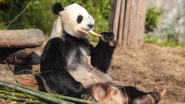 冬日里,在江苏省南京市汤山旅游度假区的野生动物世界,7只来自中国大熊猫保护研究中心的大熊猫在暖阳下活动、进食,吸引游客前来观赏。