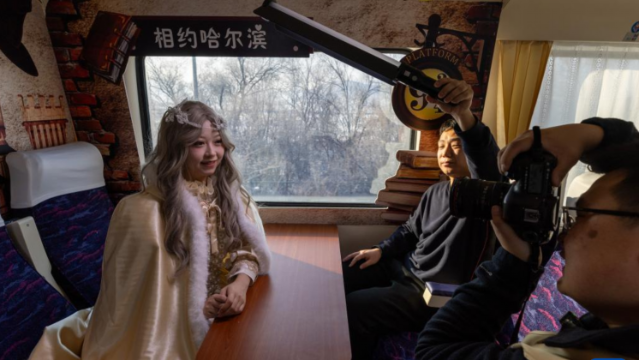 当日,中国铁路哈尔滨局集团有限公司开行首趟冰雪旅拍专列——哈尔滨至亚布力南的K5197次列车。在此列车上,乘客可在不同风格的主题车厢内体验拍照服务。据悉,中国铁路哈尔滨局集团有限公司依托哈尔滨站、亚布力南站等网红车站,设置点位,规划进出站流线,设计主题车厢,为旅客提供多种风格旅拍服饰和拍摄服务,将交通工具升级为旅游新场景。