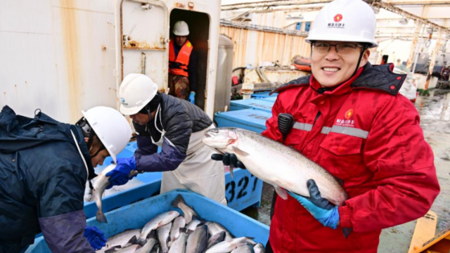 工人在养殖工船上分装三文鱼(1月12日摄)。 近日,在黄海深处离岸约130海里的青岛国家深远海绿色养殖试验区,中国自主研制的大型深海智能渔业养殖装备“深蓝2号”迎来首次三文鱼收鱼作业。据介绍,该网箱共养殖三文鱼近40万尾,存活率高,长势良好。 新华社记者 李紫恒 摄