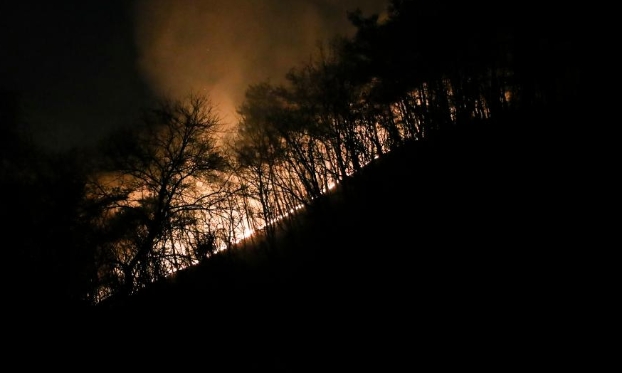 这是3月27日晚拍摄的韩国庆尚北道青松郡山火现场。新华社记者 姚琪琳 摄 当天,部分山火蔓延地区降下小雨。韩国山林厅厅长林尚燮当天下午在新闻发布会上说,部分地区的降雨虽未完全扑灭主火源,但降低了山火进一步蔓延的可能性。