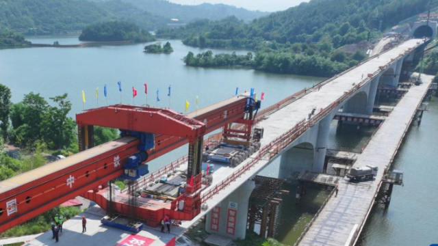 5月7日,在成渝中线高铁玄天湖双线大桥建设现场,架梁机在架设最后一孔箱梁。 当日,随着玄天湖双线大桥最后一孔箱梁架设完成,由中铁五局承建的成渝中线高铁玄天湖双线大桥顺利贯通,为后续无砟轨道施工奠定了坚实基础。 玄天湖双线大桥位于重庆市铜梁区玄天湖4A级景区内。玄天湖双线大桥连续梁全部采用我国新一代智能悬臂造桥机施工,较传统工艺降低高空作业风险50%以上,施工效率提升15%。 成渝中线高铁是我国“八纵八横”高铁网沿江通道的重要组成部分,线路自重庆枢纽重庆北站起,向西经重庆市渝北区、沙坪坝区、璧山区、铜梁区、大足区,四川省资阳市、成都市,引入成都枢纽成都站,正线全长292公里,设计时速350公里。 新华社记者 唐奕 摄 |