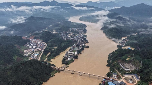 6月26日,人们在三江侗族自治县良口乡良口村清理淤泥。