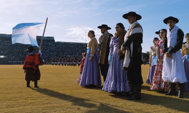 7月9日,在阿根廷首都布宜诺斯艾利斯,穿着传统服饰的民众参加军乐节。